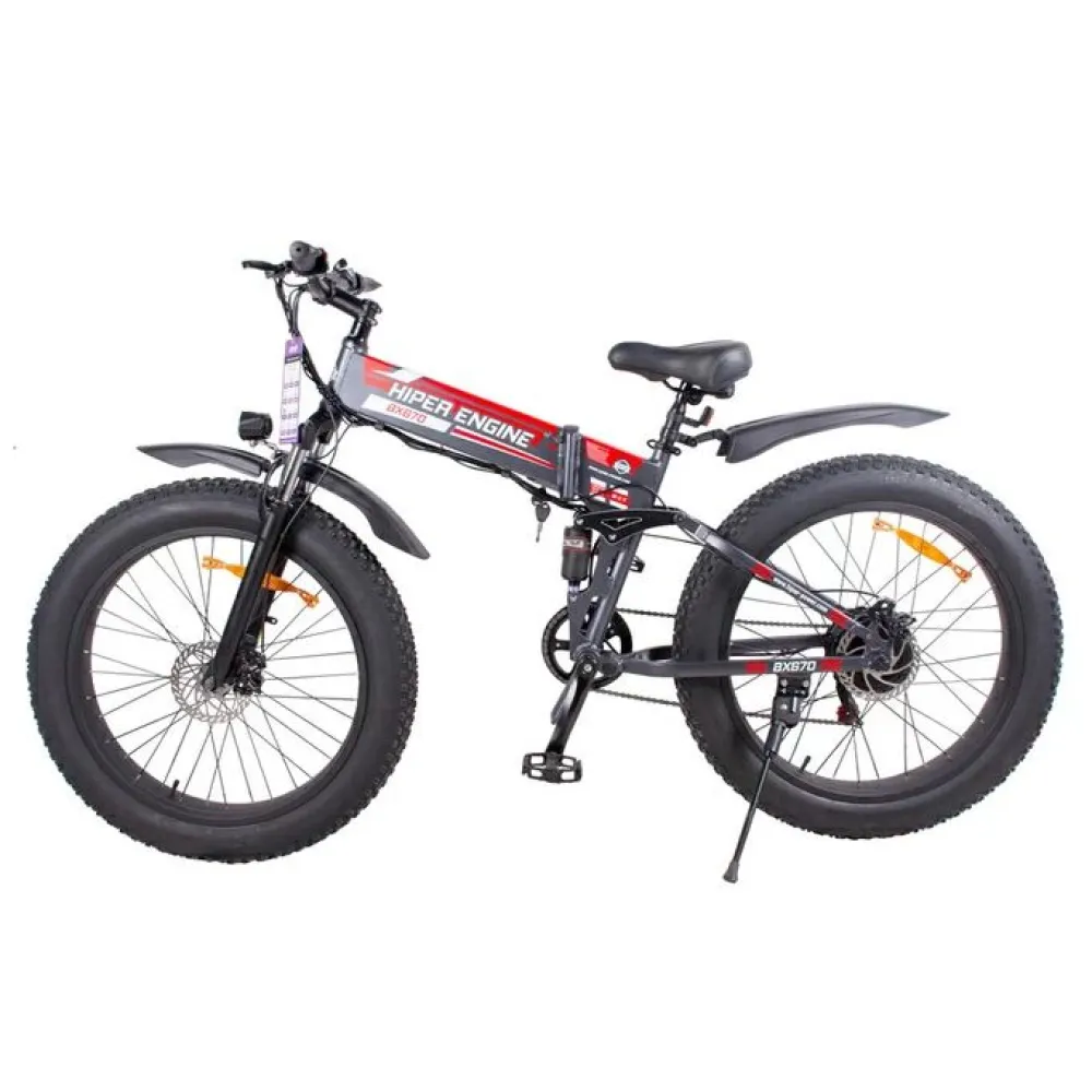 Электрофэтбайк HIPER Engine Fat BX670 (2022) – смелое решение для уверенных и ярких личностей. Мощное и грозное оформление не оставит равнодушным брутальных пользователей. Широкие колеса с усиленными протекторами и улучшенная подвеска с амортизаторами смягчают езду по пересеченной местности, позволят райдеру свободно кататься по ямам и кочкам. Перевезти байк в багажнике автомобиля или взять с собой на природу стало еще проще, модель представлена складной конструкцией и легко трансформируется за считанные секунды.